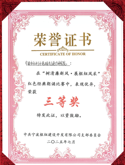 為慶祝中國(guó)共產(chǎn)黨成立104周年,2025年7月1日,寧波樞紐建設(shè)開(kāi)發(fā)有限公司隆重舉行了“紅動(dòng)樞紐·同心共建”迎“七一”主題黨建活動(dòng)。作為寧波樞紐片區(qū)重要參建單位和黨建聯(lián)盟成員,我院黨總支書(shū)記、副院長(zhǎng)王洪霞帶隊(duì)參與了本次活動(dòng),并且,我院兩位青年職工攜選送作品在“樹(shù)清廉新風(fēng)·展樞紐風(fēng)采”樞紐片區(qū)紅色經(jīng)典朗誦比賽中榮獲三等獎(jiǎng)。