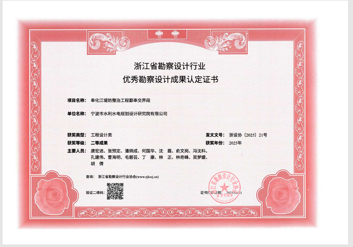 ●“奉化江堤防整治工程鄞奉交界段”獲浙江省勘察設(shè)計(jì)行業(yè)優(yōu)秀勘察設(shè)計(jì)”二等獎(jiǎng)