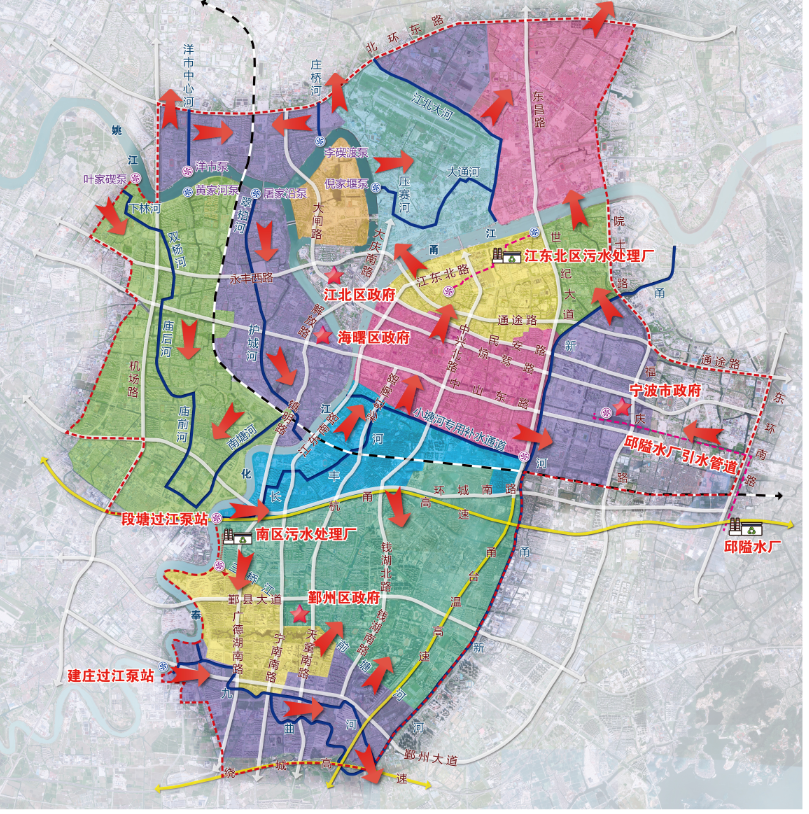 寧波市區(qū)清水環(huán)通一期工程西起機場高架、東至福慶路,北起北環(huán)高架,南至鄞州大道,面積合計約146km2,是寧波市區(qū)重要的河網(wǎng)引配水工程,亦是緩解老城內(nèi)澇壓力的有力舉措。為提升河網(wǎng)環(huán)境用水量、促進水系互聯(lián)互通、改善水體流態(tài),寧波市區(qū)清水環(huán)通一期工程創(chuàng)新性的引入“精準(zhǔn)補水、高速水路”的計理念,切實解決了寧波城區(qū)現(xiàn)狀大水漫灌的河網(wǎng)調(diào)水模式下調(diào)水效率低下、補水針對性不強等痛點、難點問題。該工程可研報告于2021年5月獲寧波市發(fā)展和改革委員會批復(fù)。