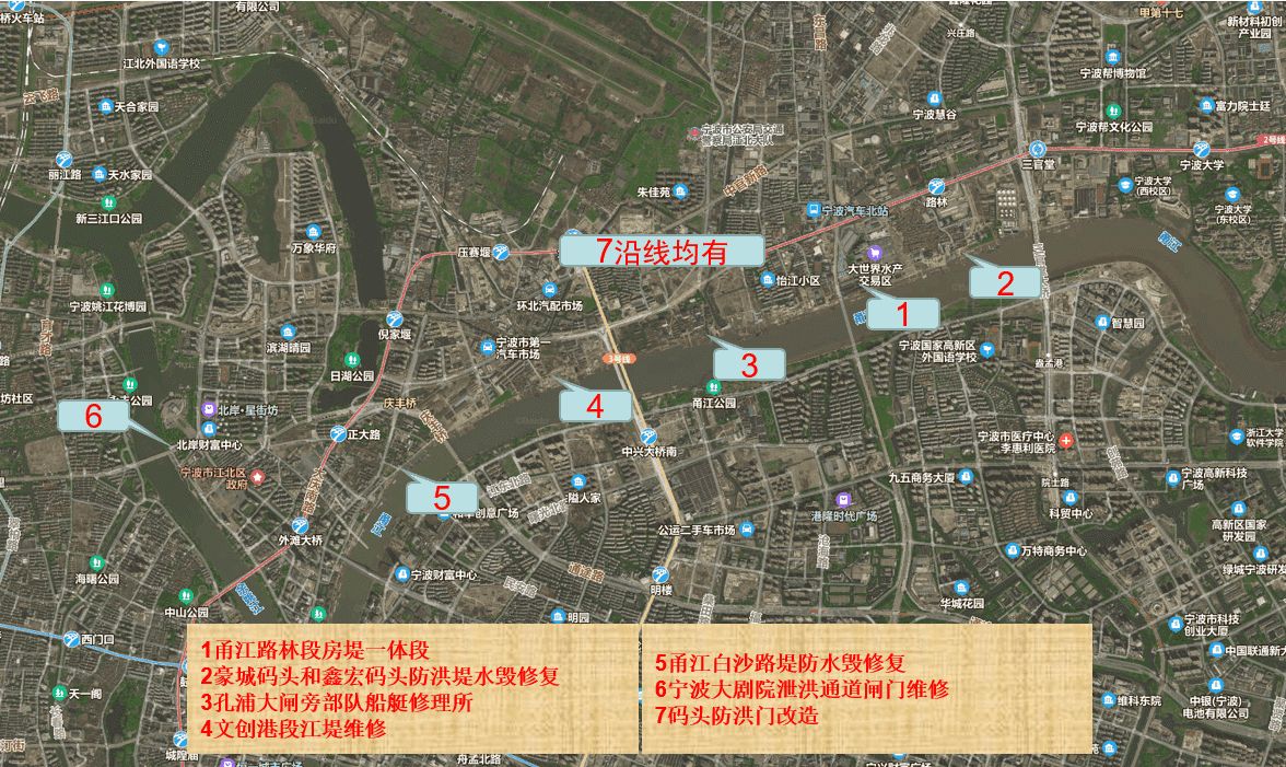 本工程建設(shè)內(nèi)容包括甬江路林段房堤一體段、豪城碼頭和鑫宏碼頭防洪堤水毀修復(fù);孔浦大閘旁部隊船艇修理所、文創(chuàng)港段江堤維修;甬江白沙路堤防水毀修復(fù);寧波大劇院泄洪通道閘門維修;碼頭防洪門改造等水毀修復(fù)水利工作。