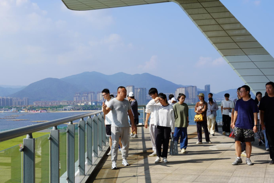 梅山灣外,銀浪拍岸;梅山灣內(nèi),碧波含翠。首先,研學(xué)隊(duì)伍到達(dá)梅山灣建設(shè)管理中心,跟隨工作人員登樓參觀,眺望南堤樞紐及附近設(shè)施,聆聽工程總體建設(shè)情況,并觀看宣傳片,了解該工程的誕生始末。