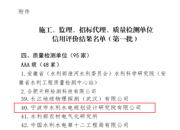 今年,寧波市水利院繼信息化業(yè)務(wù)企業(yè)信用獲評(píng)AAA最高等級(jí)后,再創(chuàng)佳績(jī),勘察、設(shè)計(jì)、咨詢、質(zhì)量檢測(cè)4項(xiàng)業(yè)務(wù)獲評(píng)AAA級(jí),水資源論證,水文、水資源調(diào)查評(píng)價(jià),水土保持方案編制3項(xiàng)獲評(píng)AAA+級(jí),均為最高等級(jí)。其中,水文、水資源調(diào)查評(píng)價(jià),質(zhì)量檢測(cè)兩項(xiàng)為首次參評(píng)。
