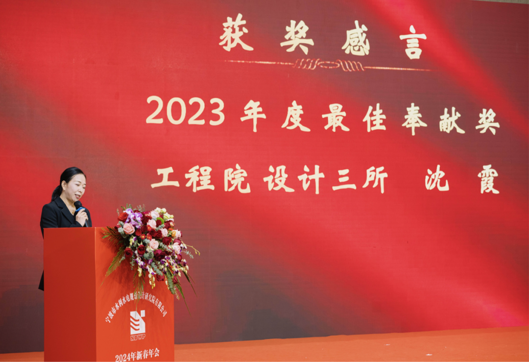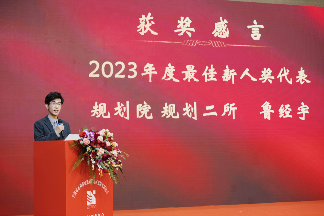 2023年度先進工作者獲獎代表勘察院勘察二所的湯文勇、2023年度最佳奉獻獎獲獎?wù)吖こ淘涸O(shè)計三所的沈霞、2023年度最佳新人獎獲獎代表規(guī)劃院規(guī)劃二所的魯經(jīng)宇,先后上臺發(fā)表獲獎感言,以真摯的情感、質(zhì)樸的語言和滿滿的憧憬,表達了自己與企業(yè)共同成長過程中的勵志故事和切身感悟,表達了寧波院中堅力量、團隊骨干和新兵后輩的豪情壯志。